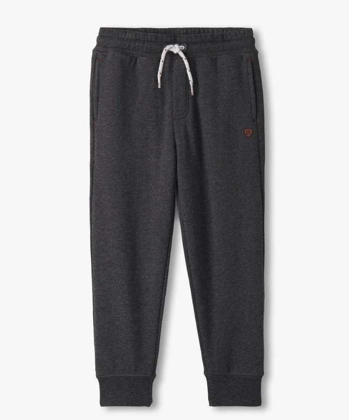 Keep him comfortable in the Boys Charcoal Melange Joggers, crafted from 100% cotton washed loop French terry for soft, breathable wear. These slim-fit joggers feature a deep charcoal grey hue and ribbed cuffs for a sporty, tapered look. The elastic waistband includes a functional white drawcord accented with small red details, adding a playful touch to the design. With two front slit pockets for everyday essentials, these joggers are perfect for both active days and lounging.