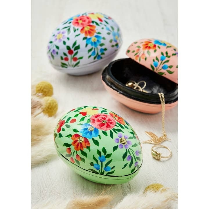 Make someone's Easter 'eggstra' special by presenting a gift in an egg-shaped gift box that adapts to an Easter ornament! A beautifully hand painted Kashmiri 2-piece container decorated in a flowing multi-floral pattern.
