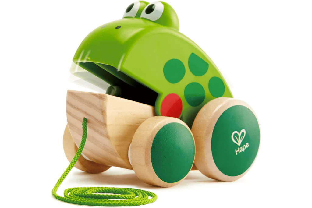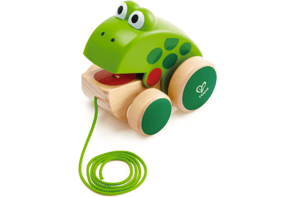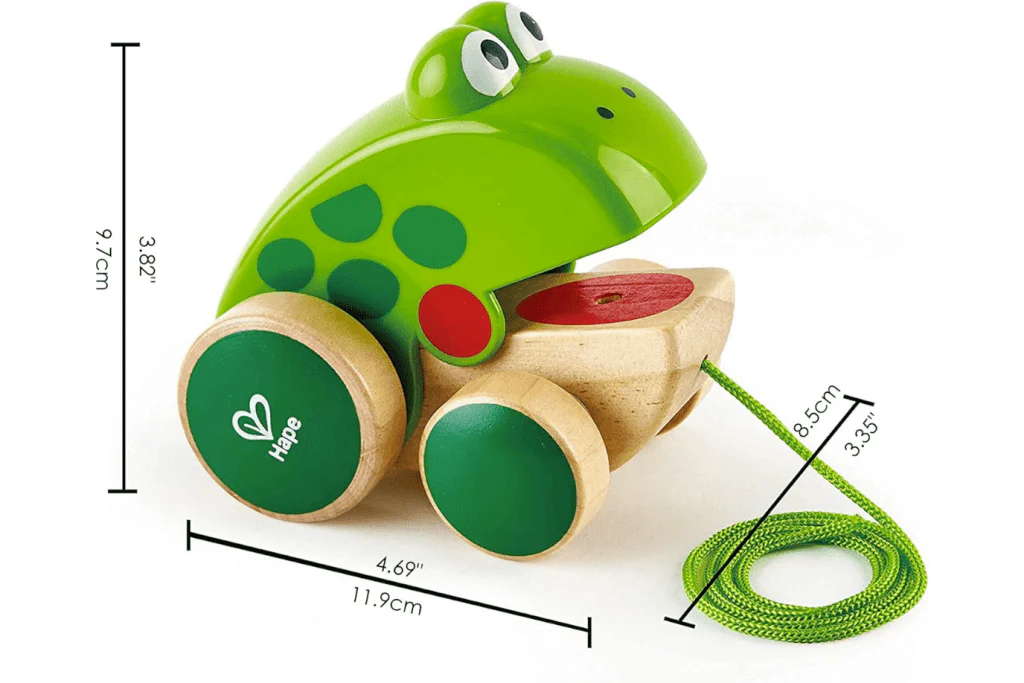 - The frog-themed pull toy is great for encouraging children to crawl and a great companion when they start to walk or run around the house