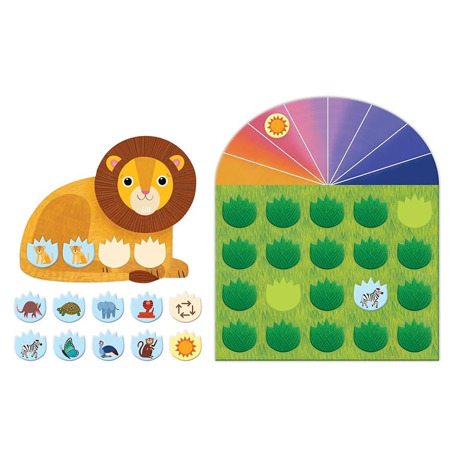 - Includes: 1 game board, 1 Lion Mat, 1 sun token, 20 grass shaped tiles, fun facts, and instructions