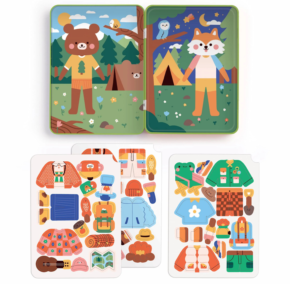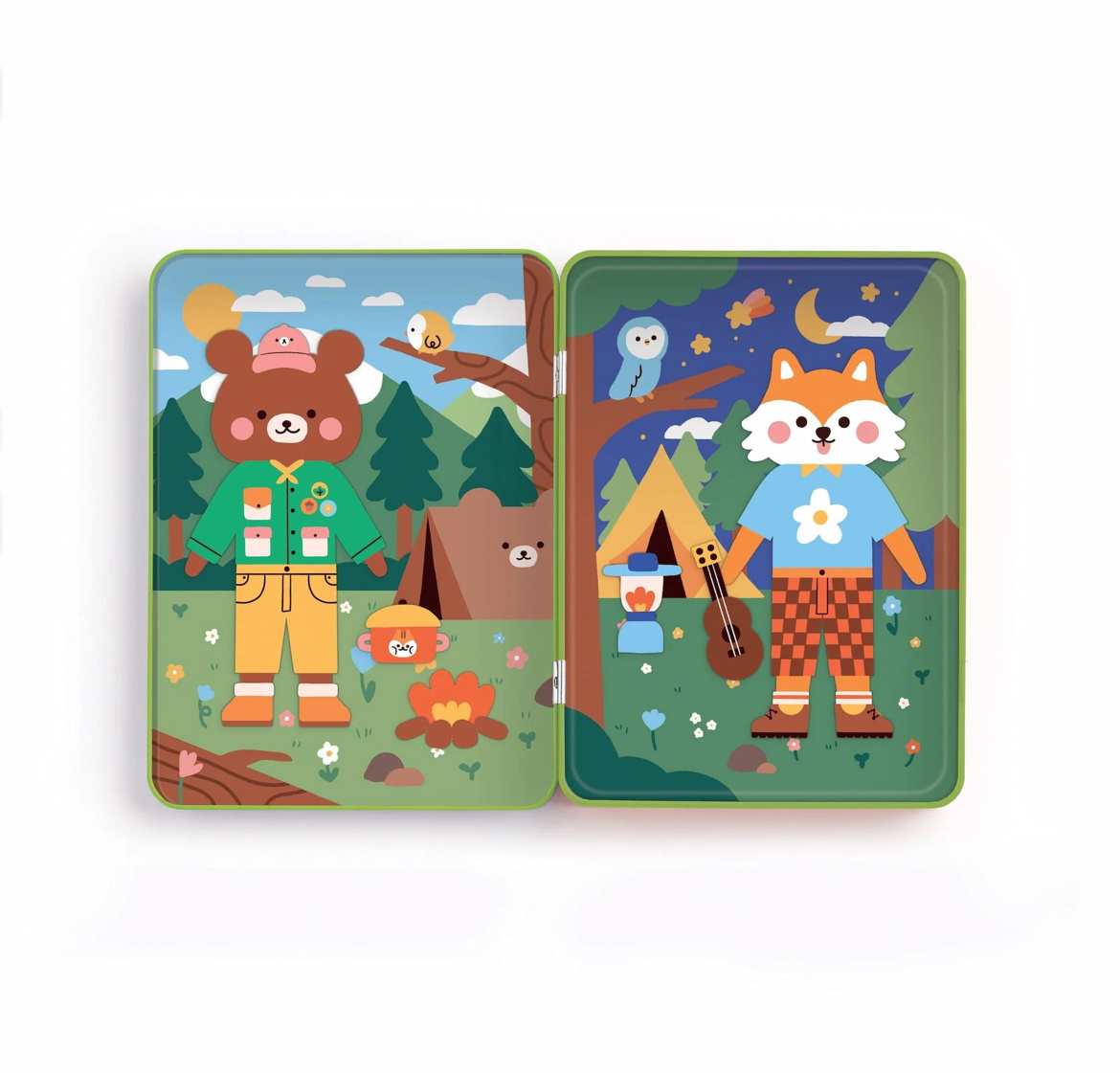 The Happy Camper Magnetic Play Set includes 2 colorful scenes and 3 sheets of mix and match magnets for dressing up the colorful wildlife campers. The sturdy tin package offers hours of imaginative play with easy cleanup and storage. The Magnetic Tins are the perfect children's travel toy and quiet time activity.