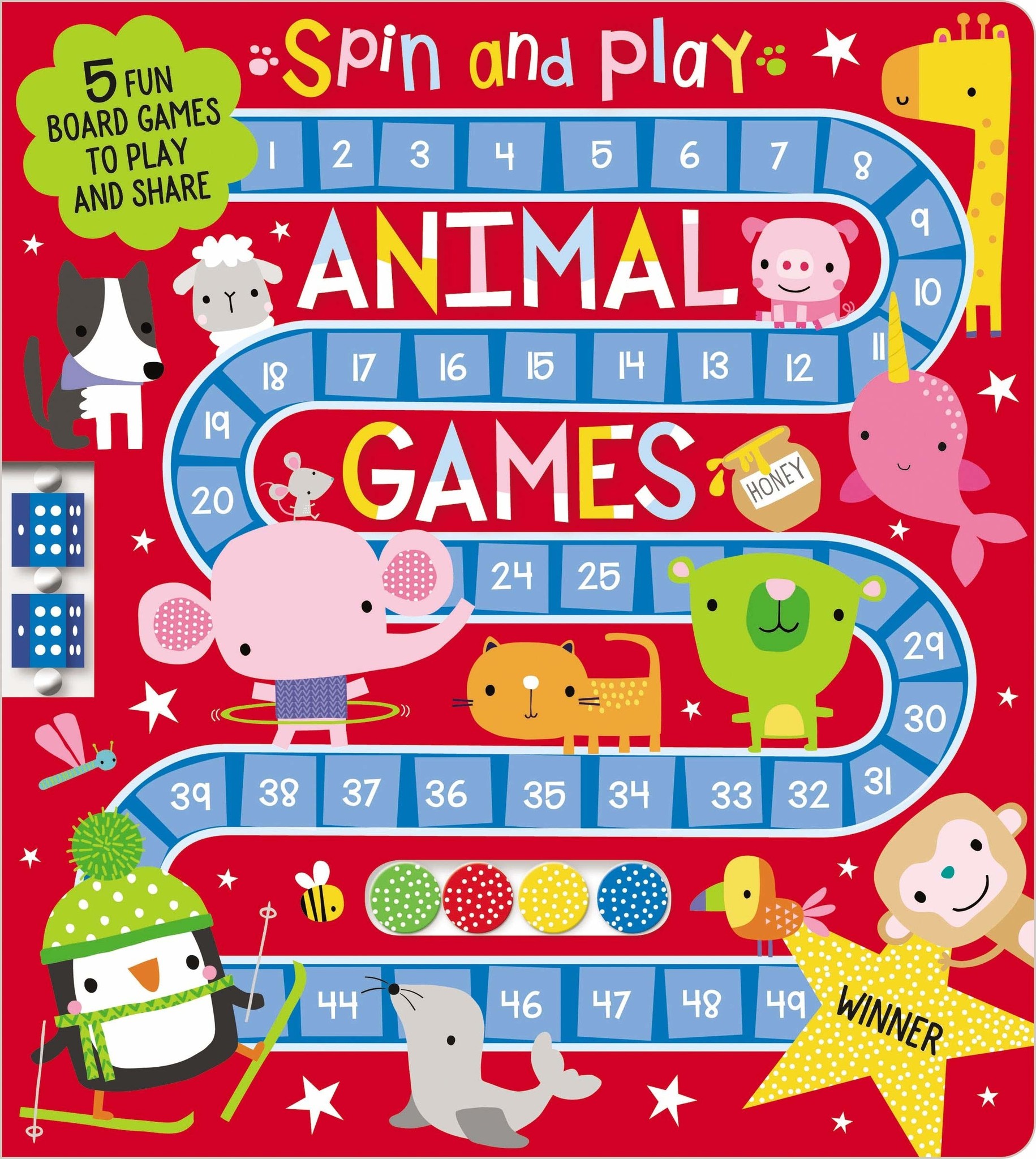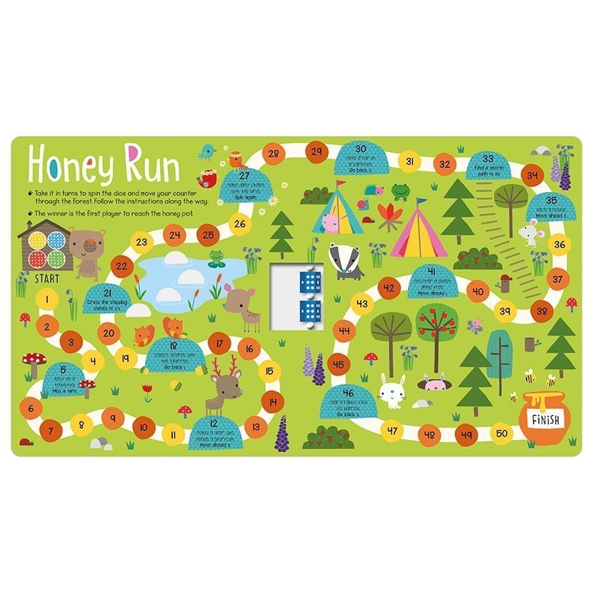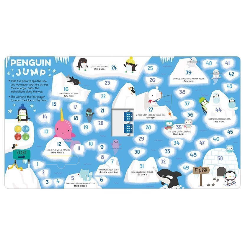 This innovative games book allows you to share and play animal-themed games wherever you go! Lay the book flat and choose a game. Then, take counters from the front pocket and spin the dice to play! Guide the penguins as they hop over icebergs, herd sheep back to their pens, find your way through the woods to the honey pot, and more in this fun title! AN INNOVATIVE GAMES BOOK TO SHARE AND PLAY WHEREVER YOU GO