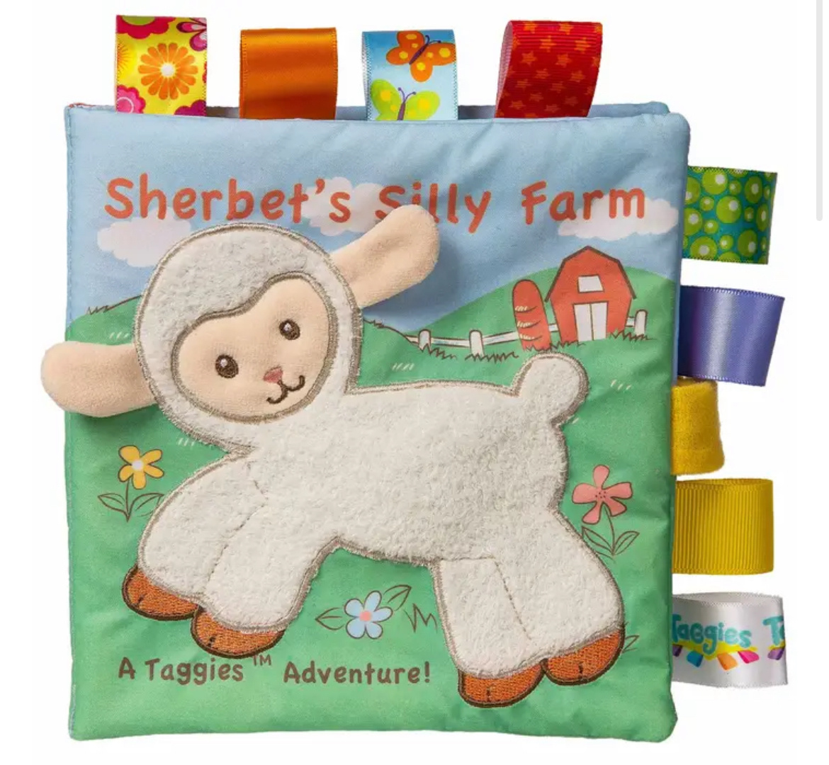 Taggies books are winning awards for their combination of stimulation (squeaker and crinkle paper inside) and soothing features (eight Taggies ribbons and textured fabric covers). Each book tells a short, sweet story in eight pages with hook fastener closure.
