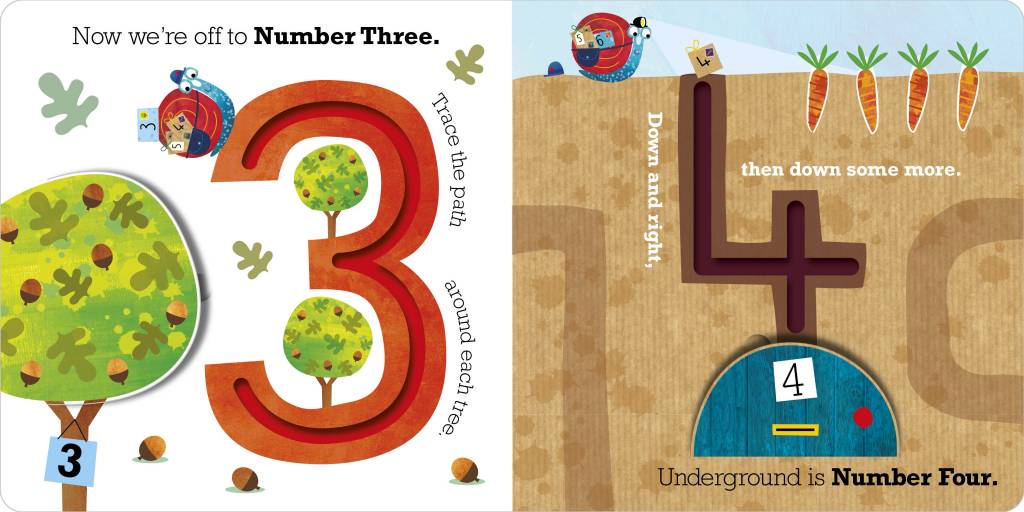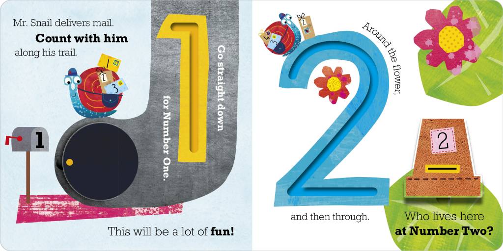 Mr. Snails Counting Trails Board Book - Mr. Snail delivers mail, count with him along his trail! With recessed numbers and flaps to lift on every page, children will enjoy practicing to count as they read along.