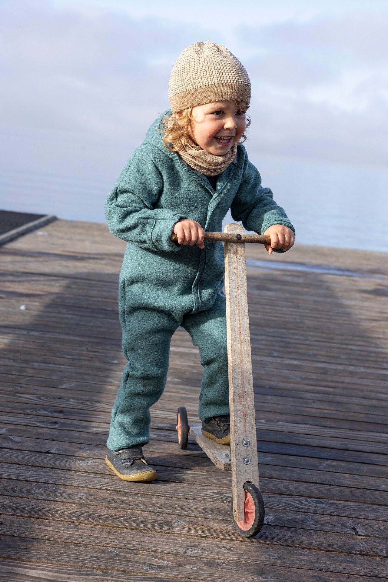 From head to toe in extra soft boiled wool - that is our disana boiled wool overall. The foldable cuffs on the arms and legs, the fit, the beautiful large corozo buttons. It is the many details that make our boiled overalls a very special piece of clothing. The enclosed air chambers in the boiled wool ensure a unique climate comfort and make our overall the ideal cover when playing in the cold and snow. The well thought out hood shape is even more comfortable for the little ones and closes better on the face. The hood and neck are now lined with fine organic cotton. This guarantees that nothing can scratch these sensitive areas.