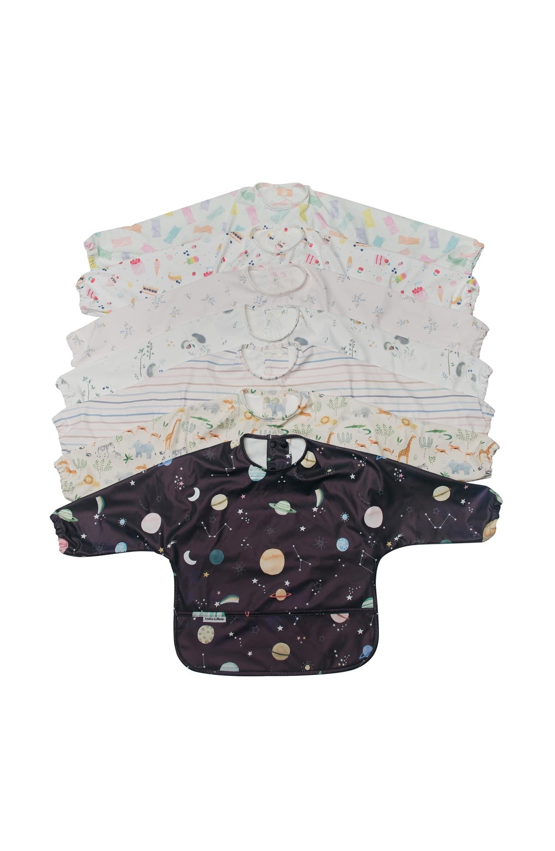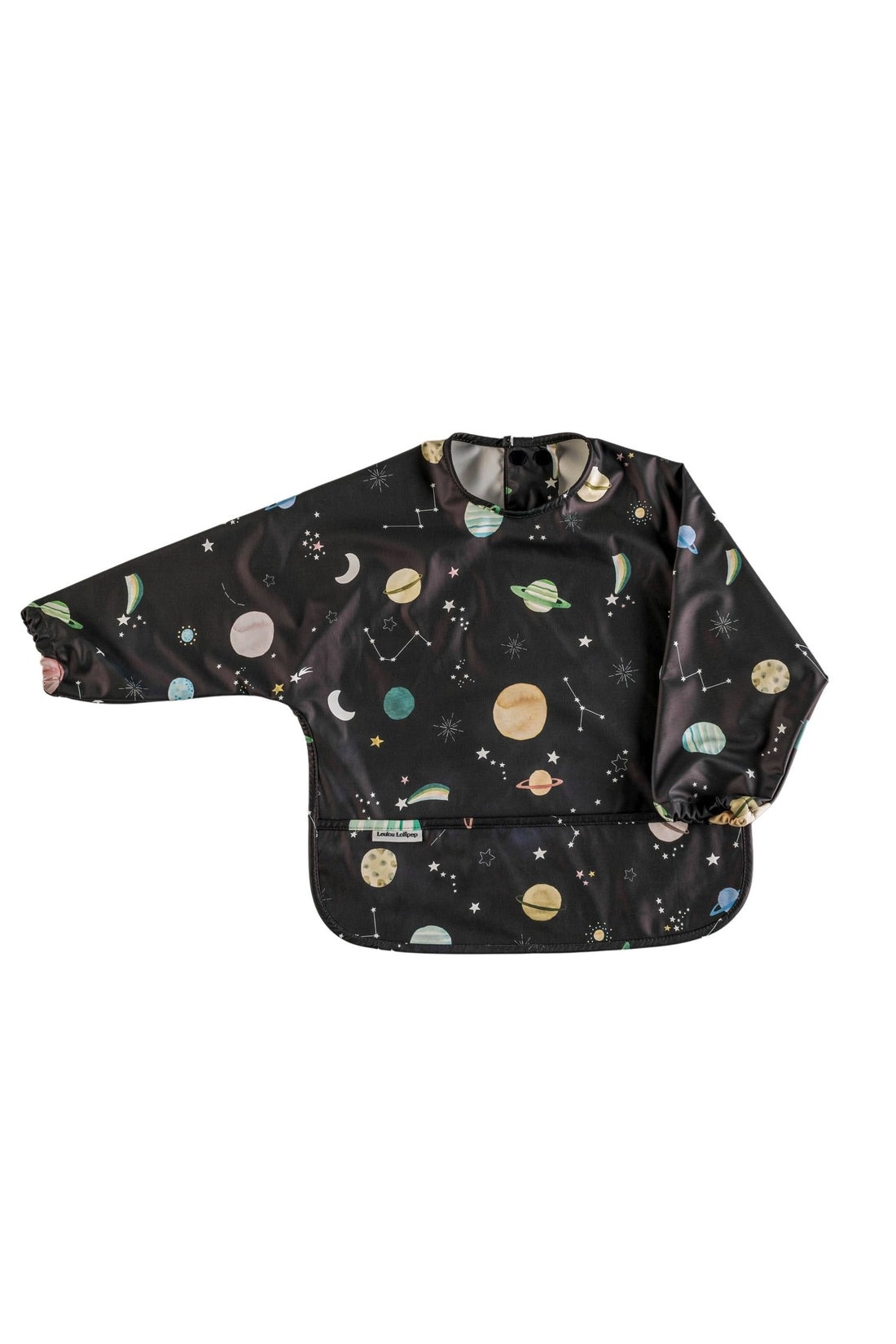 Loulou Lollipop's long sleeve waterproof bib is made with 100% eco-friendly recycled polyester with TPU coating that is waterproof, stain, and odor resistant. Standard 100 by Oeko-tex certified. Designed with an adjustable neckline with snaps and elasticized cuffs allow for a comfortable fit that grows with baby to toddler from 6 months to 3 years old.