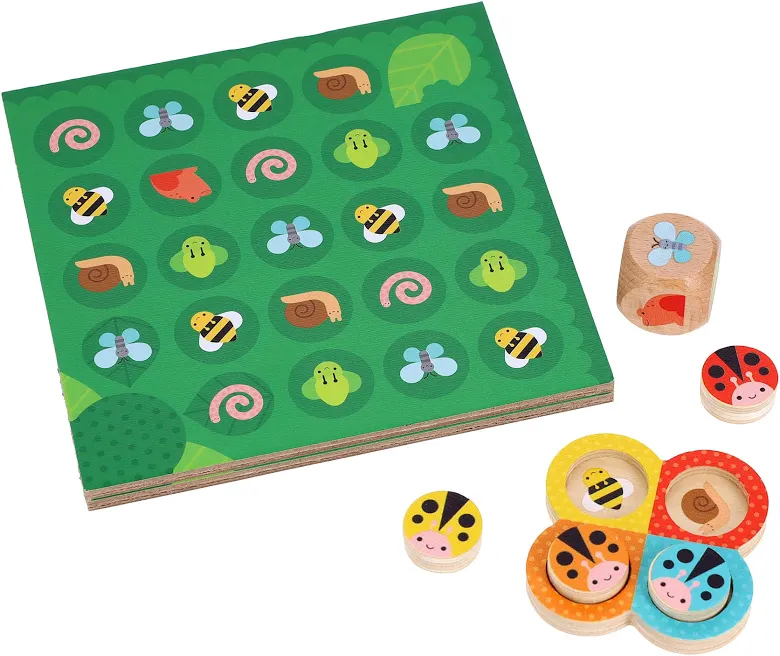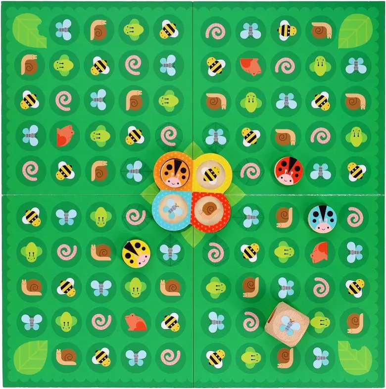 Roll the die to determine which of the garden friends you're going to meet; for example, if you roll a butterfly, then move your ladybug to the nearest butterfly space. Rolling an adorable aphid gets you an extra turn. But watch out because rolling a cheeky frog will send you backward! The first player to get their ladybug back home wins.