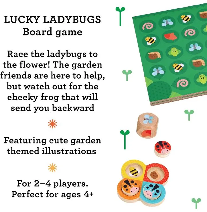 THOUGHTFULLY DESIGNED - Inside the box are 4 wooden ladybugs, a wooden flower, wooden die, gameboard, and instructions. The plastic-free game is made using FSC paper and wood, and the packaging is printed using 75% recycled materials and vegetable inks.