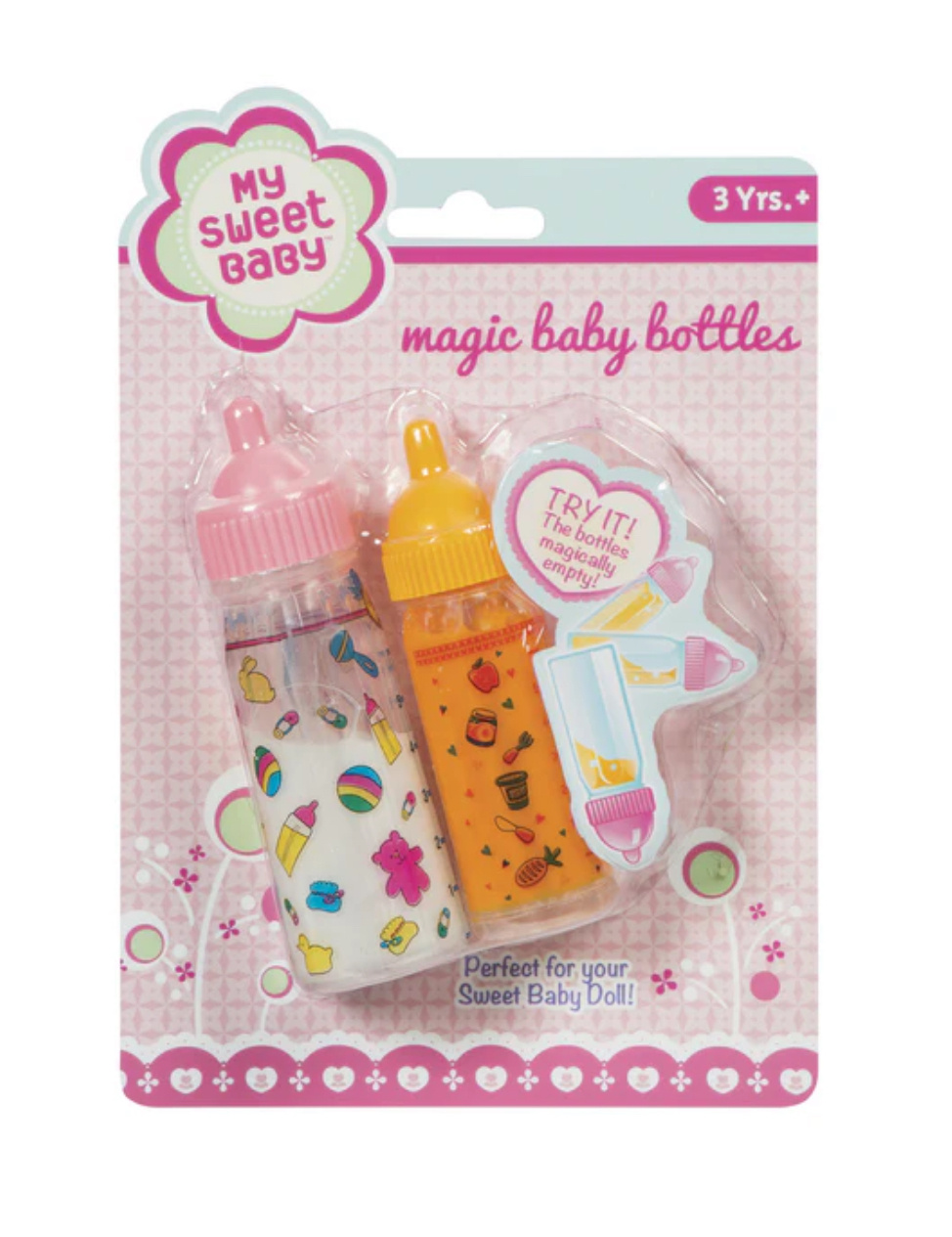 Feeding time is more fun with My Sweet Baby Magic Baby Bottles for your baby toy dolls. These lightweight plastic bottles appear to empty when the baby doll drinks, sparking the imagination and providing hours of enjoyment. The fluid level in each bottle decreases more quickly the farther its tilted. Each bottle is decorated with cute wraparound graphics to entertain young minds.