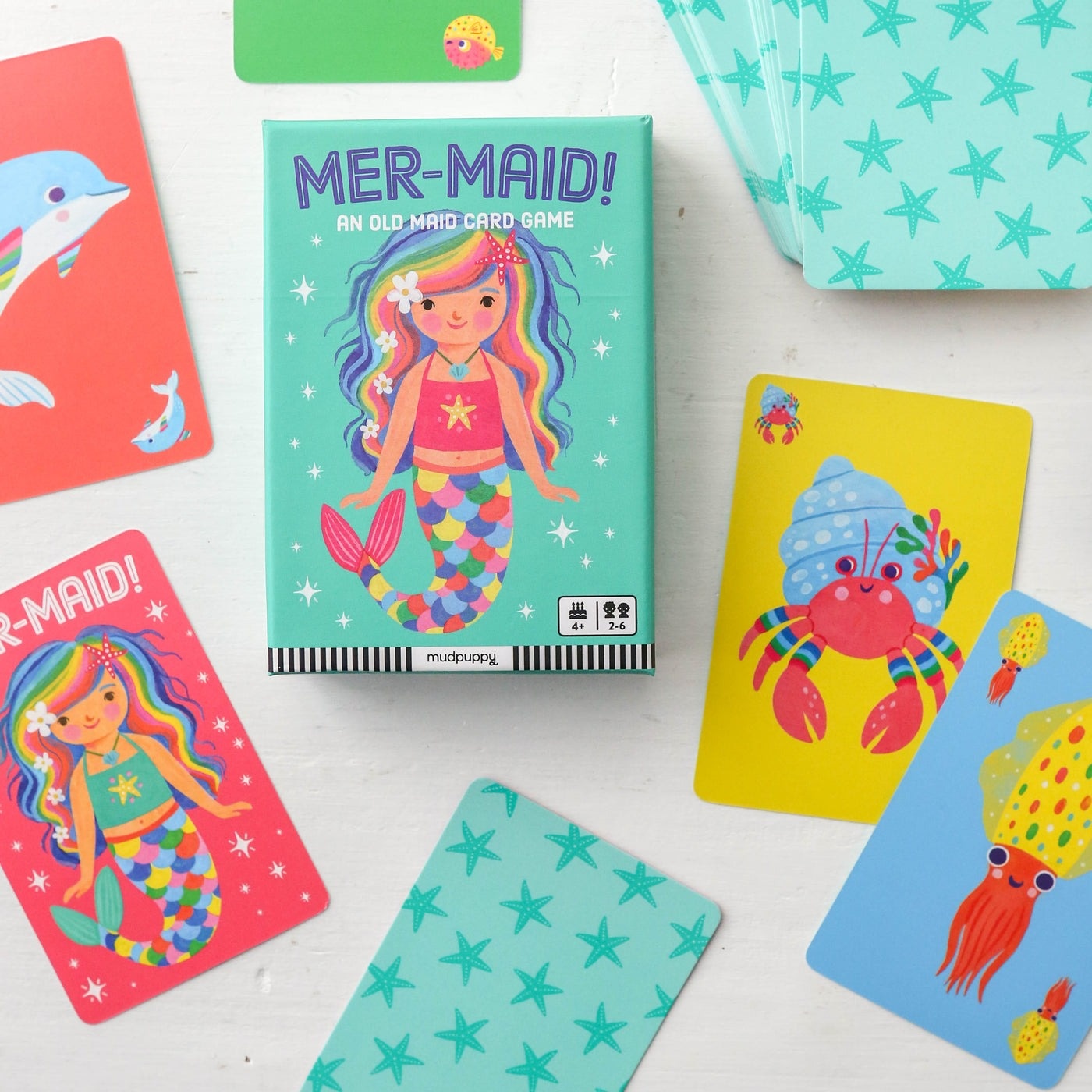 The Mer-Maid! Card Game from Mudpuppy reimagines the classic Old Maid card game with whimsical mermaid-themed illustrations that capture the imagination and delight players of all ages. Its also easy to play! Simply deal the cards evenly, players draw and match pairs and most importantly avoid being left with the Mermaid magic card. The player with the most pairs wins! The vibrant artwork and durable cardstock ensure hours of fun and laughter as players try to avoid being left holding the mermaid card!