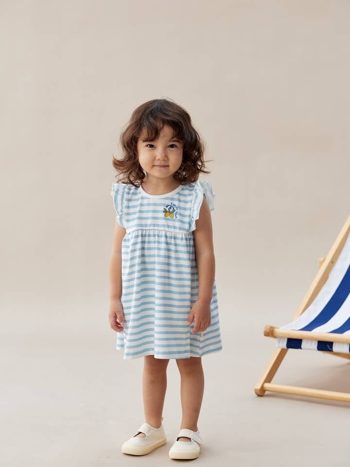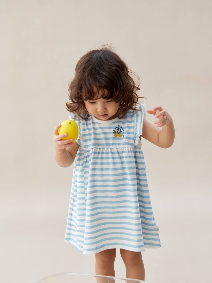 The tank-top dress is made from soft, sustainable organic cotton and features buttons at the back. It is designed with a flared skirt for a stylish look.