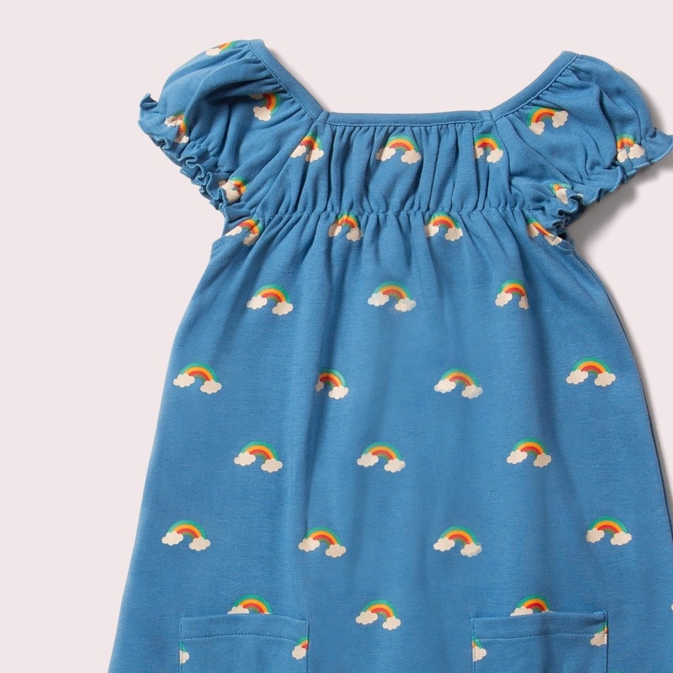 No poppers, no buttons, no zips... no fuss. Just pop on this dress and they're ready to go! It's a really easy to wear summer style, with an elasticated gathered top, frill capped sleeves and a wide skirt that gives lots of room for movement as they play. It's made from beautifully soft, fantastic quality organic cotton that will keep them comfy all day, and come up like new wash after wash.