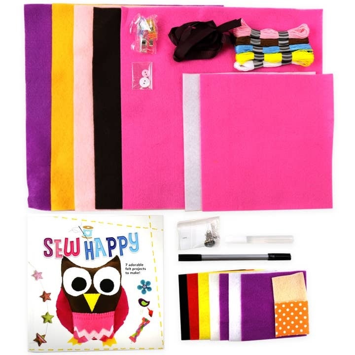 Adorable, fun-to-sew crafts! Sew Happy comes with everything you need to make cute and simple projects. Make an owl pillow, fun finger puppets, sweet birdie clips, pretty flower brooches and more!