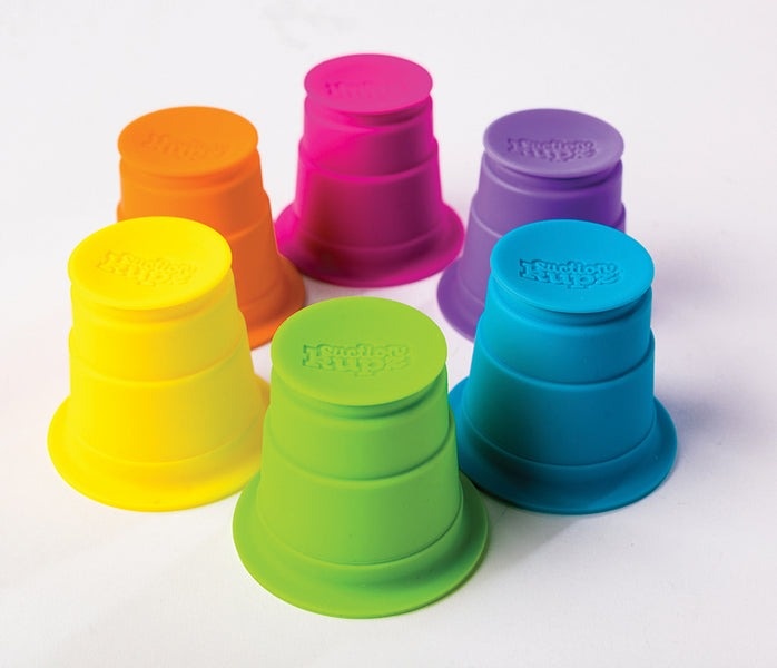 Stack, roll, stick, and sip! Each of these vibrant, squishy silicone cups features a suction cup bottom plus a suctioning rim at the top. Stack them up tall. Stick them together and then pull them apart to hear them POP! 100% food and dishwasher safe!