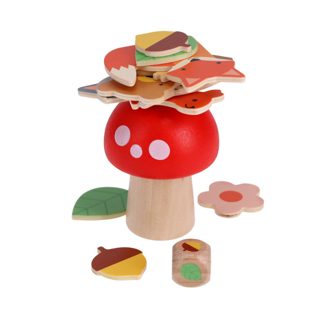 Bunny, hedgehog, squirrel, bear, and more are ready to pile up on a bright wooden mushroom-but watch out for the wobbles!